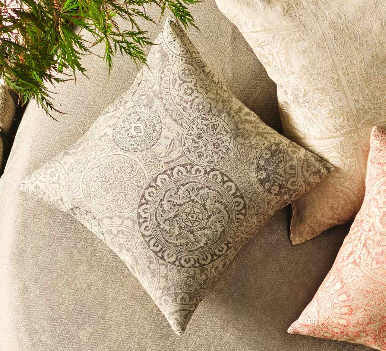 Dieser kunstvoll gewebte Kissenbezug von Leitner Leinen im Dessin Intarsio aus Reinleinen zeigt den Reichtum der Natur in ihrer floralen Vielfalt. Stilisierte Rosen, Tulpen und Gerbera, verbunden durch geschwungene Rauten, Ranken und filigrane Ornamente, kommen durch die fein aufeinander abgestimmten Farben besonders schön zur Geltung und verleihen dem edlen Kissen eine zurückhaltende Eleganz.