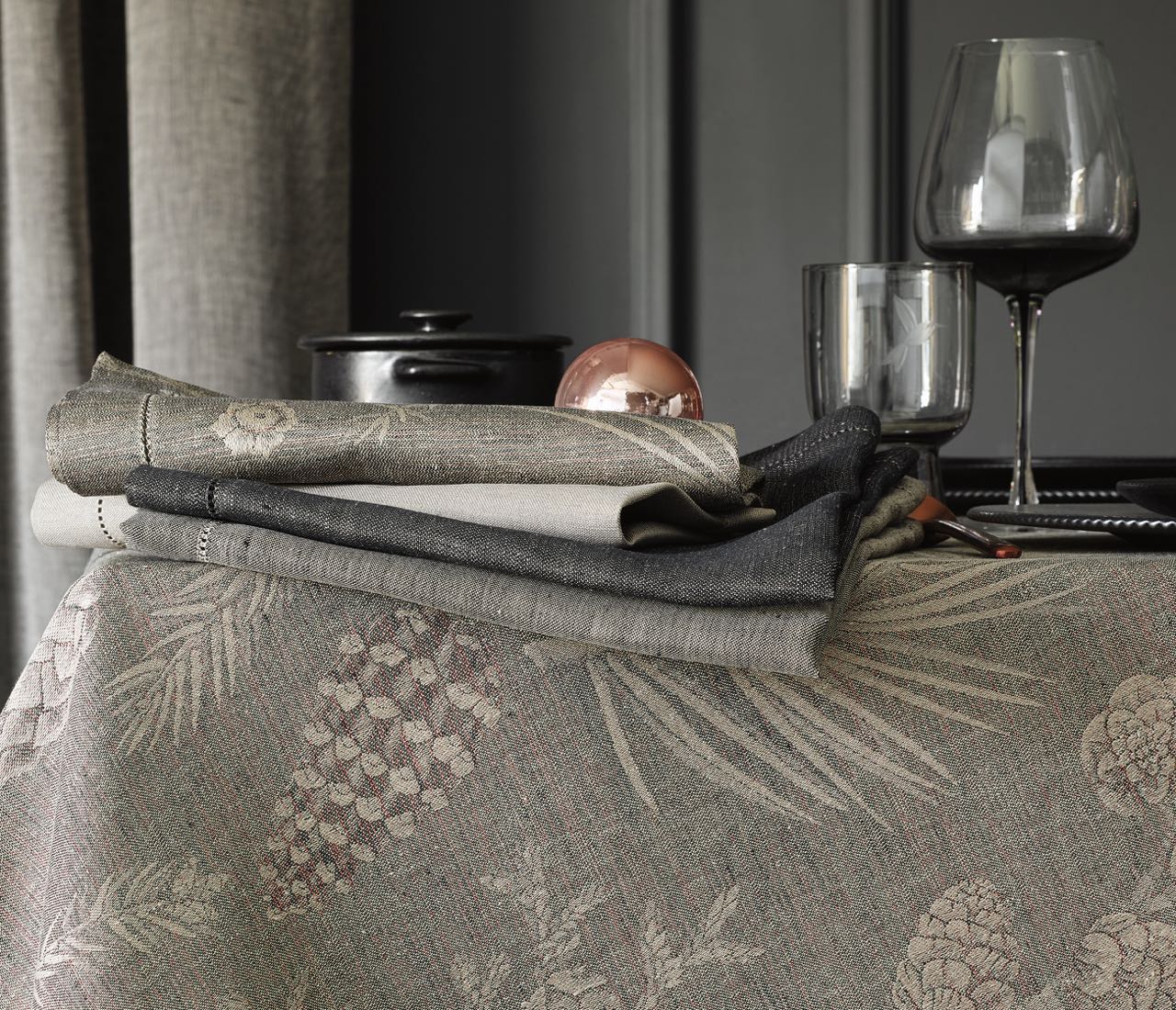 Diese kunstvoll gewebte Serviette von Leitner Leinen im Dessin Foresta aus Reinleinen zeigt den Reichtum des Waldes. Fein gewebte Zweige, Zapfen und Äste verschiedener Gehölzarten kommen durch die harmonisch aufeinander abgestimmten Farben besonders schön zur Geltung und verleihen der hochwertigen Serviette eine edle Optik in zurückhaltender Eleganz.