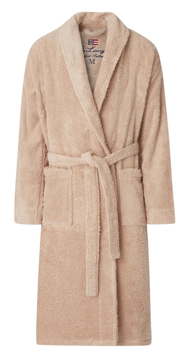 Dieser hochwertige Bademantel von Lexington aus schönem Frottee ist sehr weich und kuschelig und durch den großzügigen Schnitt ungemein bequem. Der dekorative Schalkragen schmiegt sich wunderbar an und verleiht dem edlen Bademantel eine sportlich-lässige Note. Der schöne Bademantel hat zwei aufgesetzte Vordertaschen, die praktisch und dekorativ zugleich sind. Die Größe M entspricht bei Damen 40/42 und bei Herren 48.